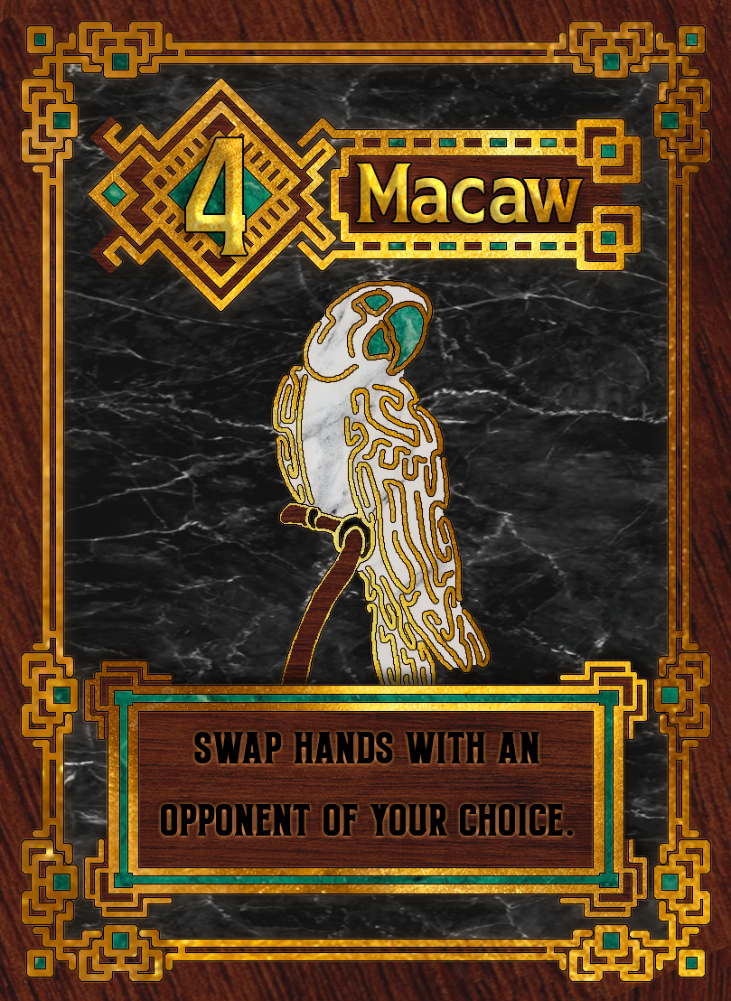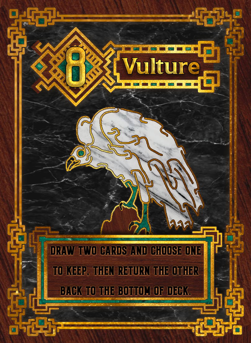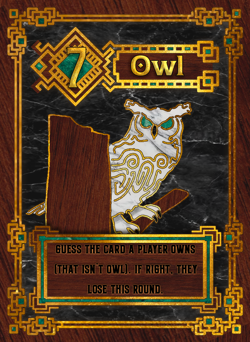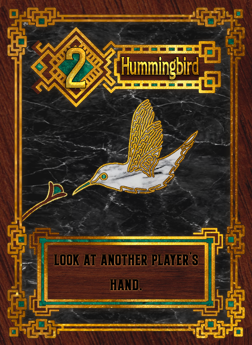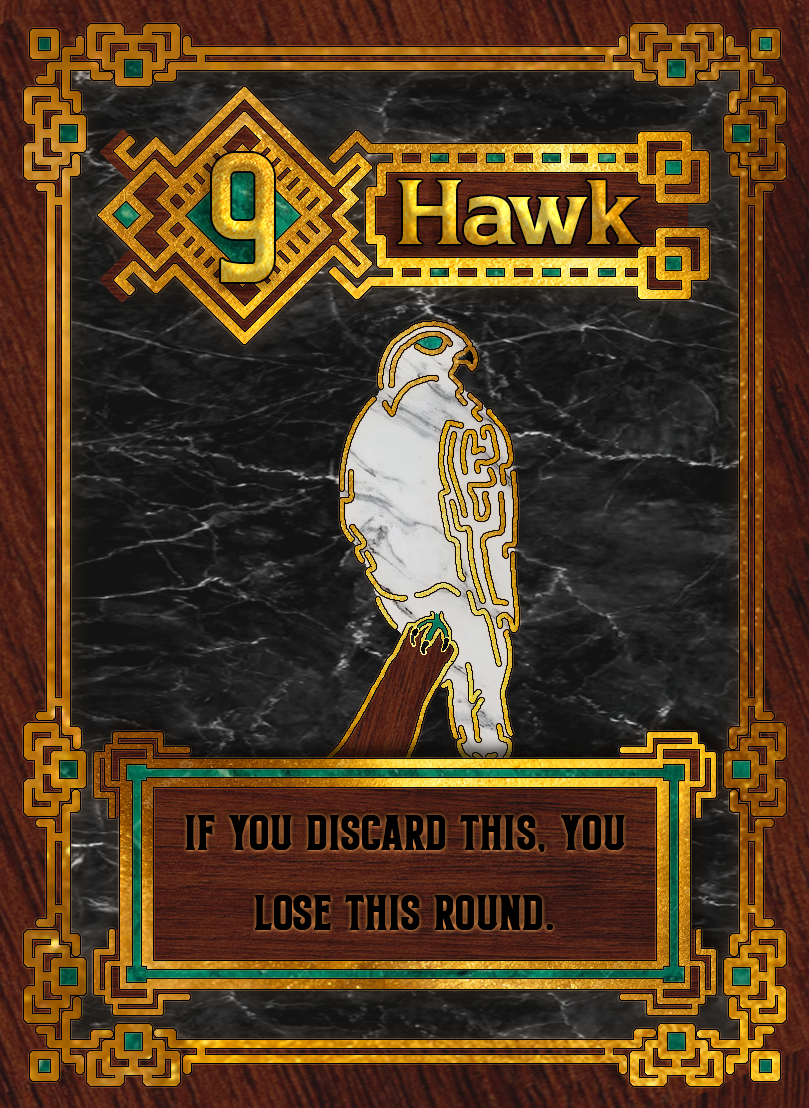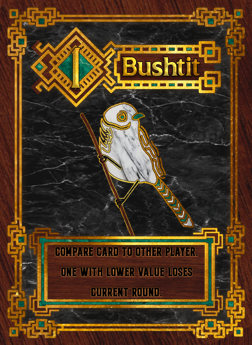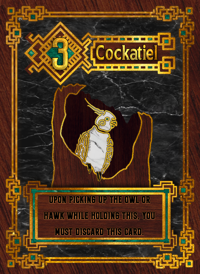 This was based around a card game called Love Letter, where the point is to either last the entire round without being knocked out of the game or to end the round with the highest numbered card. Being that it was an art class I wanted to do something unique, so I settled on birds. I dug through dozens of different bird species to settle on a handful of birds that would, more or less, fit the role of the card they were assigned to.